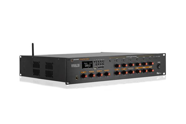 Mixer amplificato multizona 240W con player integrato per l'ascolto di sorgenti WiFi / radio FM / MP3 USB / SD / Bluetooth / AirPlay (servizi di streaming audio. Ad esempio: YouTube, Apple Music, Amazon Music...) Telecomando IR in dotazione. Regolatori di volume a 6 zone indipendenti. Alimentazione AC110-240V & 24Vdc. Consumo 400VA. 6 ingressi miscelabili + sorgenti + ingresso emergenza prioritario + base microfonica multizona. CH1 (priority): mic JACK 5-8mV 600Ω. CH2-3-4: mic XLR 5-8mV 600Ω alimentazione phantom (selezionabile) / line XLR 150-470mV 10KΩ (commutabili). CH5-6: line RCA. CH7 EMC: ingresso di emergenza prioritario per messaggi di evacuazione o di servizio tramite Vivaldi Ulisse GRM1. CH8: paging ingresso base microfonica multizona Vivaldi Ulisse BM6*. Funzione MUTE regolabile. Line out RCA: 0,775V (0dBV) uscita dipendente dai canali di ingresso e indipendente dal volume. Uscita generale 4-8 Ω , 100V. Uscite di zona 100V. Antenna 75Ω per ricezione RADIO FM. Controllo toni alti/bassi. Dimensioni 484x88x405 mm (LxHxP). 2U rack. Peso 9,4 Kg. Colore cabinet nero, serigrafie arancioni. Cabinet metallo. Standard rack